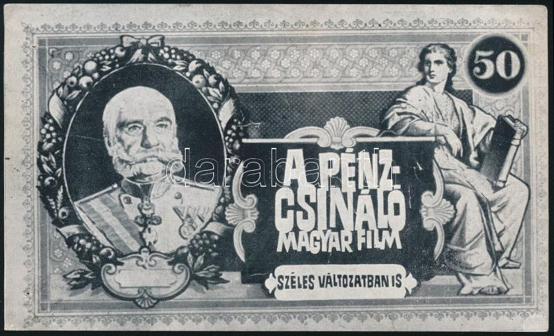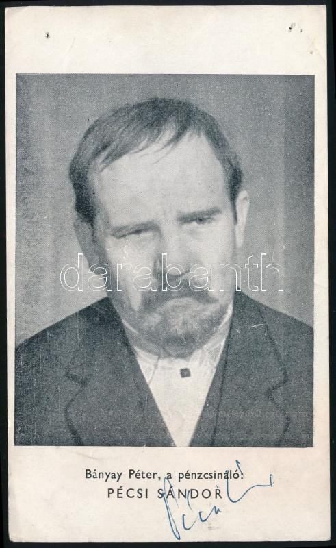 Pécsi Sándor (1922-1972) kétszeres Kossuth-díjas színész autográf aláírása őt ábrázoló nyomtatványon (A pénzcsináló c. 1964-es filmben, Bányai Péter szerepében), 14,5x8,5 cm