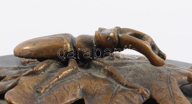 Antik bronz szarvasbogár tölgyfa levélen, fa lapon, 16x12 cm