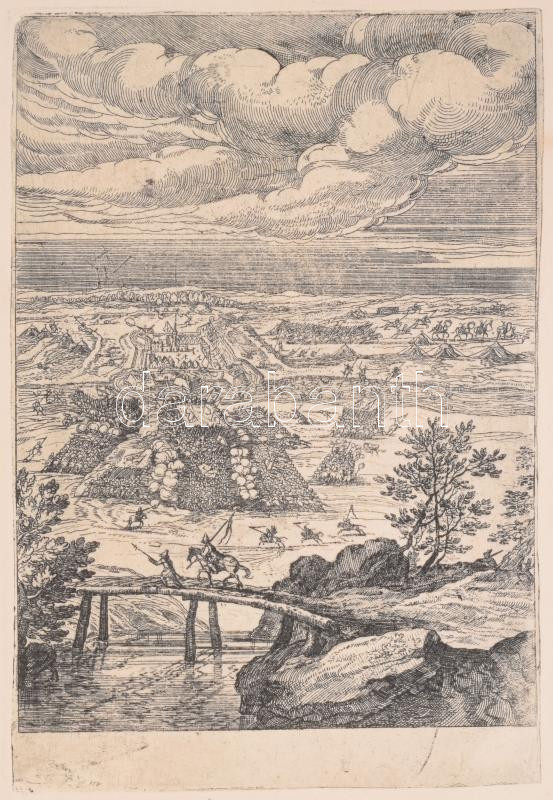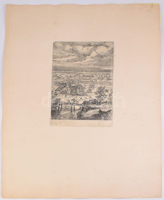 1934 Törökök és magyarok harcát ábrázoló csatajelenet, várostrom, papír, rézmetszet, foltos, kis gyűrődésekkel, 22x14 cm, lap: 49x35 cm