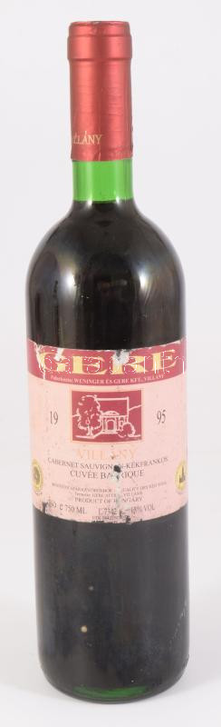 1995 Gere Villányi Cabernet Sauvignon - Kékfrankos Cuvée Barrique, bontatlan palack száraz vörösbor, 13%, pincében szakszerűen tárolt, kopott címkével, 0,75 l.