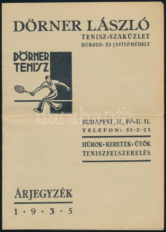 1935 Bp. II., Dörner László tenisz szaküzlete két lapos, hajtott kartonnyomtatványa termék- és szolgáltatásárakkal, postai feladás miatt hajtva, jó állapotban