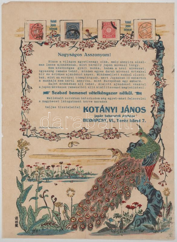 Kotányi János japán művészi tárgyak, színezett reklám nyomtatvány, eredeti japán bélyegekkel 25x35 cm