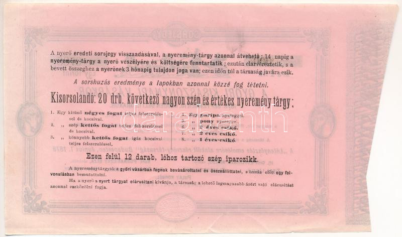 Budapest 1878. "Lótenyésztés emelésére alakúlt részvény-társaság - A győri kisasszonynapi vásárkor" sorsjegy 1Ft értékben, szárazpecséttel "0005 0788" T:F szép papír, beszakadás