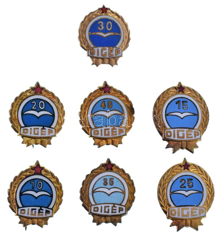 1950 k. "DIGÉP (Diósgyőri Gépgyár Hengermű)" zománcozott törzsgárda jelvények (7xklf), 10-15-20-25-30-35-40 évek után (23x19 és 26x21mm között) T:AU,XF
