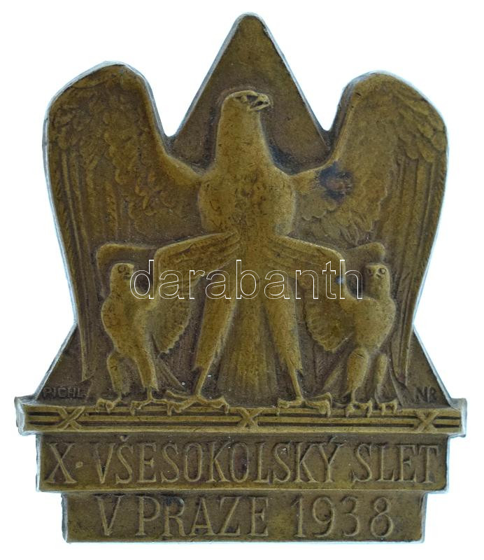 Csehszlovákia 1938. "X. Sokol Fesztivál Prágában" bronz jelvény. Szign.: "Sejnost" (32x30mm) T:AU