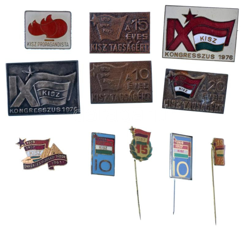 Vegyes, 11db-os szocialista "KISZ" jelvény, közte: 1961. "Önkéntes Ifjúsági Tábor 1961" zománcozott fém jelvény + 1970 k. "KISZ Propagandista" műgyantás fém jelvény + "KISZ Kongresszus 1976" (2xklf, fém és zománcozott bronz jelvény) T:AU-XF