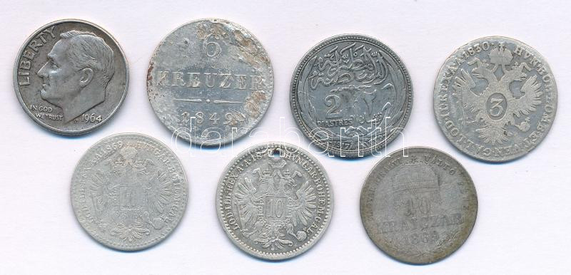 Mixed, 7pcs silver coin lot, within: Austria 1830-1872. 3 Kreuzer - 10 Kreuzer Ag (4xdiff) + Hungary 1869. 10 Kreuzer Ag + Egypt 1917. 2 Piastres Ag + USA 1964. Dime Ag C:mixed