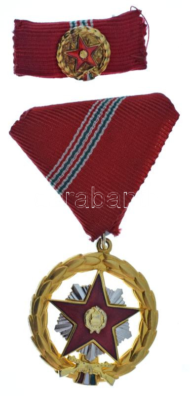 Hungary 1957. "Distinguished Service Medal" gilt, silver plated, enamelled decoration with ribbon, with miniature on thin ribbon C:AU patina