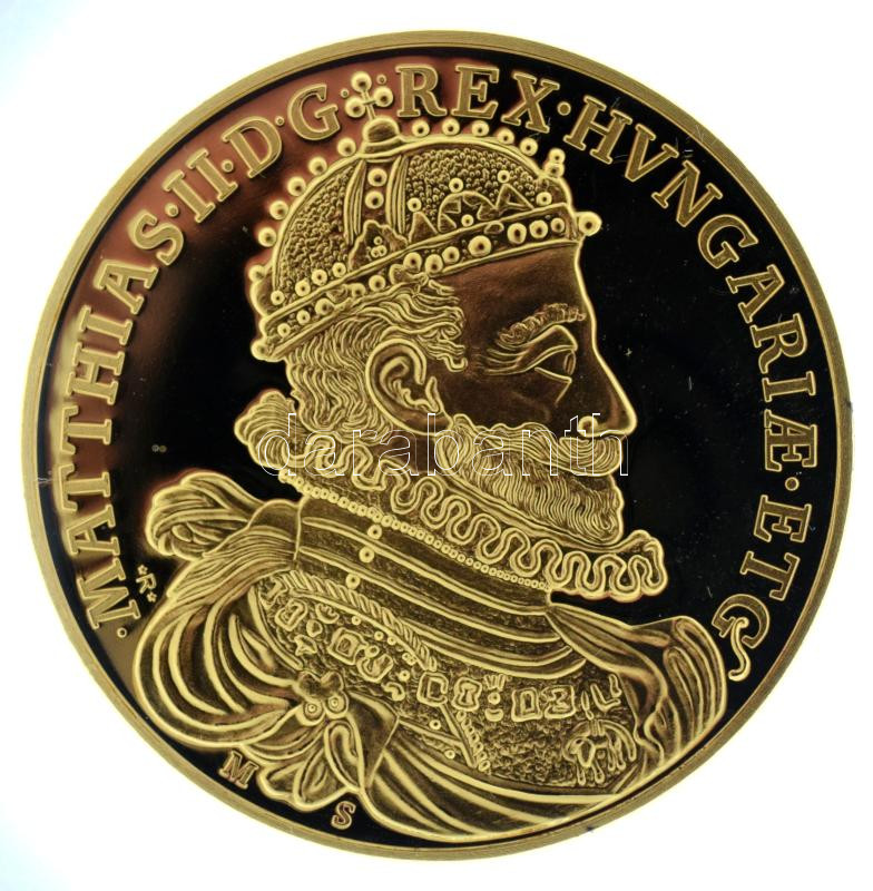 DN "Magyar Aranyóriások - II. Mátyás 6 aranydukát, koronázási érem, 1608" aranyozott Cu utánveret kapszulában (46mm) T:PP