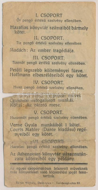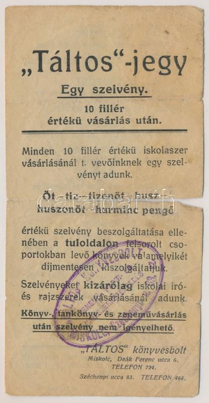 1930 k. Miskolc " 'Táltos'-jegy" könyvesbolti utalvány bélyegzéssel T:VG,G majdnem kettészakadt darab