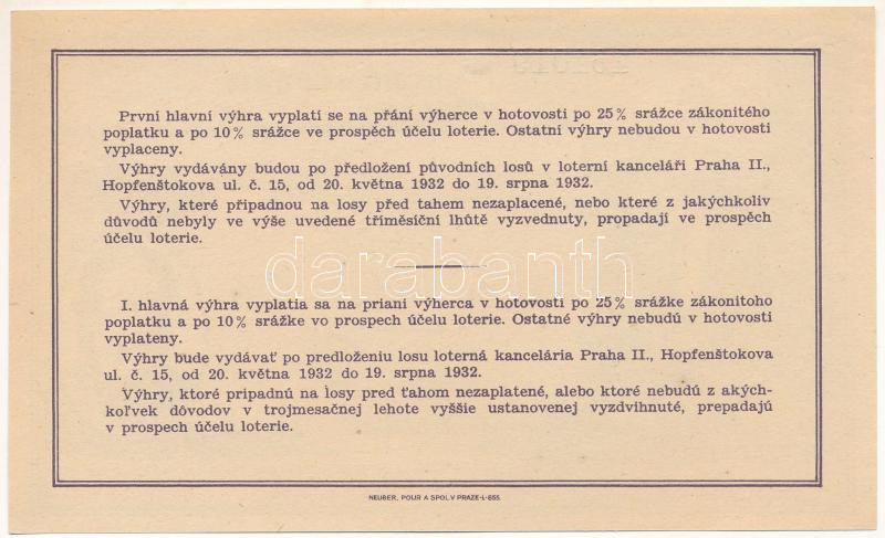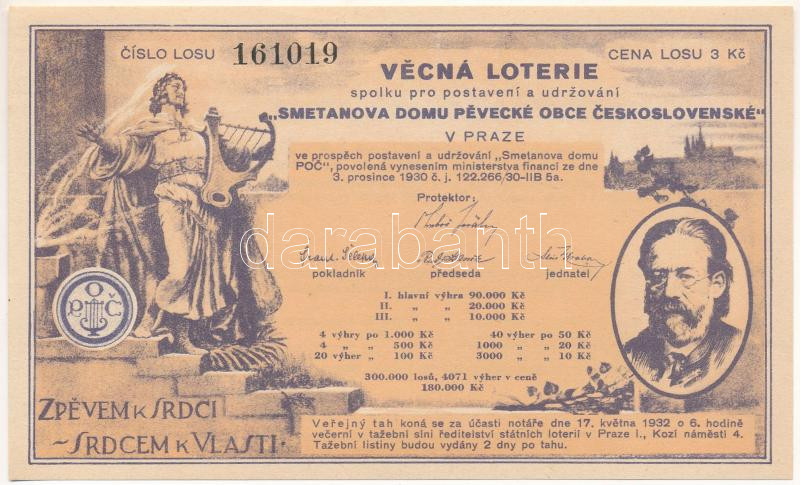 Csehszlovákia 1930. "Csehszlovák Énekesközösség Smetana Házának építéséért és karbantartásáért felelős Egyesület sorsjegye" "161019" sorszámmal T:AU
