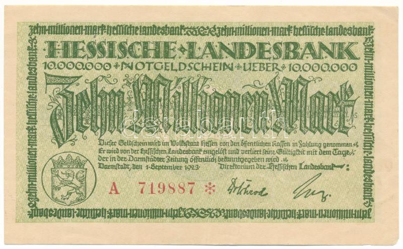 Német Birodalom / Weimari Köztársaság / Darmstadt 1923. 10.000.000M "A 719887" vízjeles papíron T:F szép papír