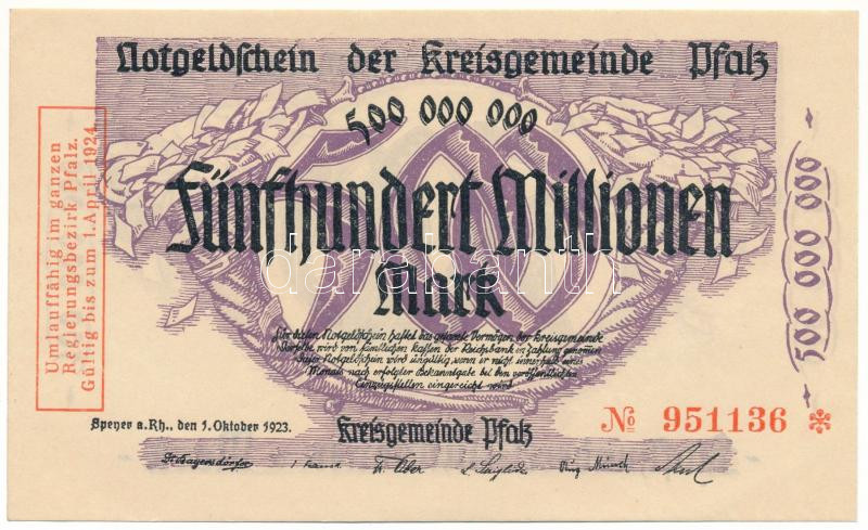 German Empire / Weimar Republic / Pfalz 1923. 500.000.000 Mark necessity note on watermarked paper, "951136" C:UNC,AU