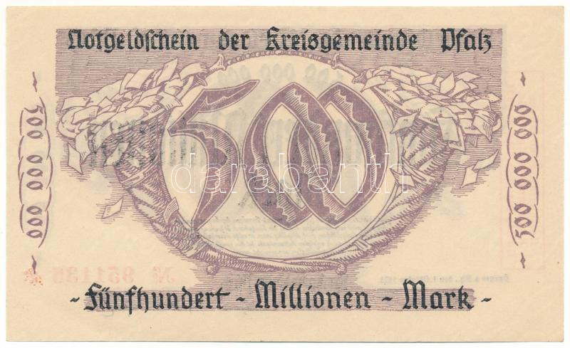 Német Birodalom / Weimari Köztársaság / Pfalz 1923. 500.000.000M szükségpénz vízjeles papíron, "951136" T:UNC,AU