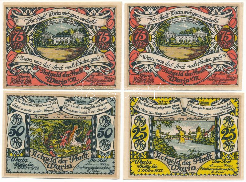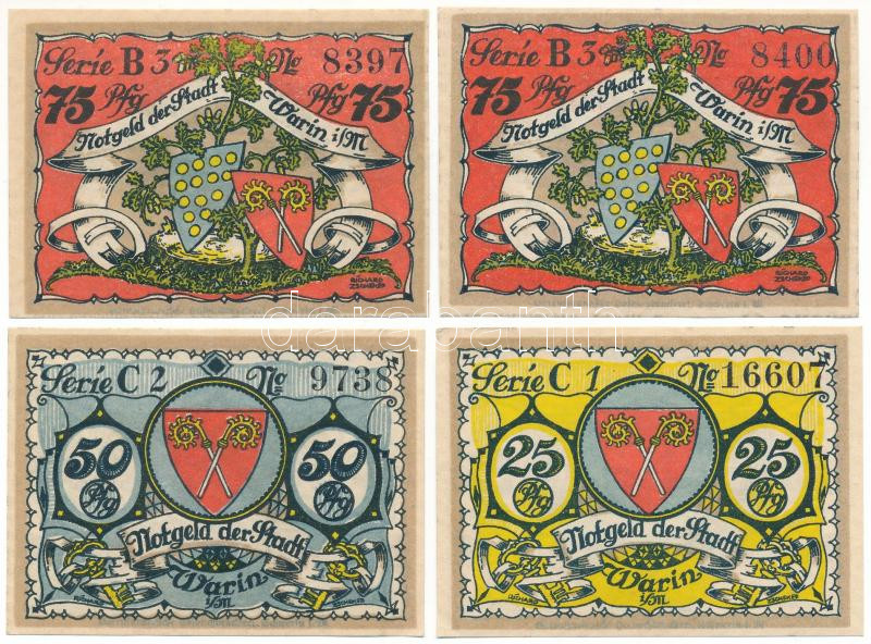 Német Birodalom / Weimari Köztársaság / Warin 1922. 25pf + 50pf + 75pf (2x) közeli sorszámúak "B3 8397, B3 8400" T:AU