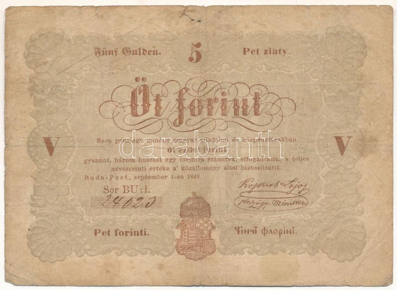 1848. 5Ft barna nyomat "BU:l. 24020" "Kossuth bankó" T:VG