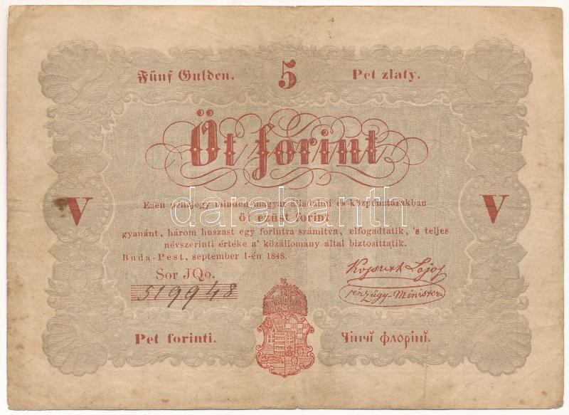 1848. 5Ft vörösesbarna nyomat "JQo. 519948" "Kossuth bankó" T:F folt