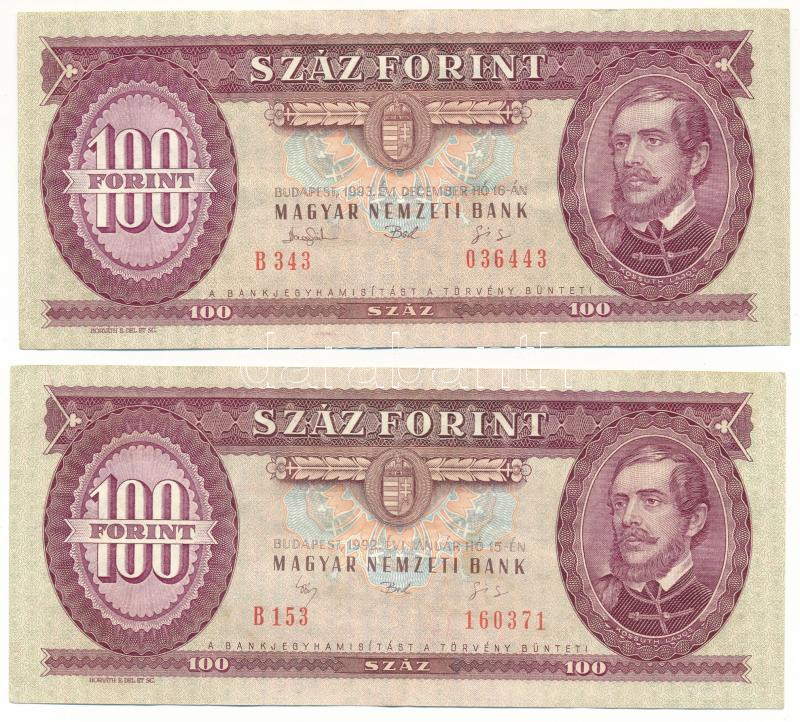 1992. 100Ft "B 153 160371" + 1993. 100Ft "B 343 036443" T:F szép papír