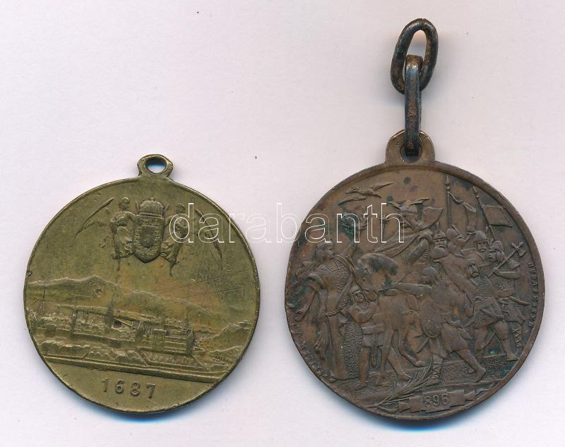 1896. "Magyarország ezeréves fennállásának és ős Budavára emlékékre 1896" bronz emlékérem füllel (31mm) + "Ezeréves történetünk ezredekre remény nekünk" kétoldalas bronz emlékérem. Szign.: Steiner A.F. (32mm) T:VF
