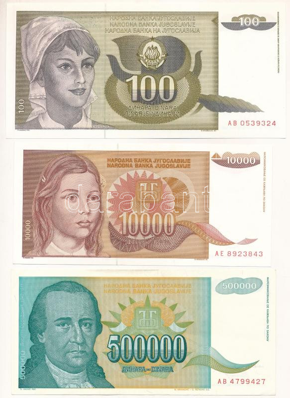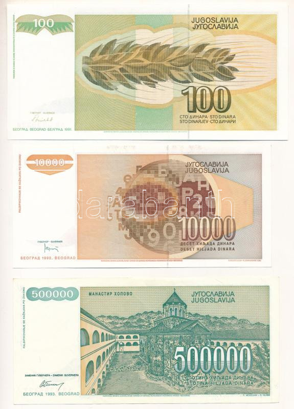 Jugoszlávia 1991. 100D + 1992. 10.000D + 1993. 500.000D T:UNC-AU