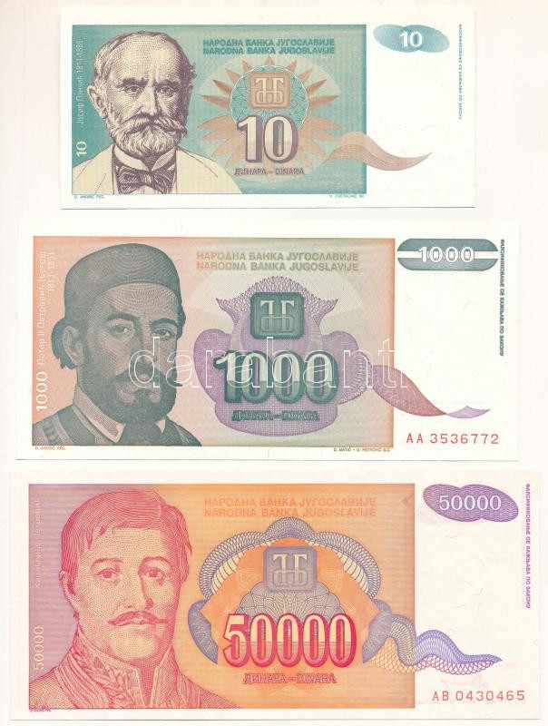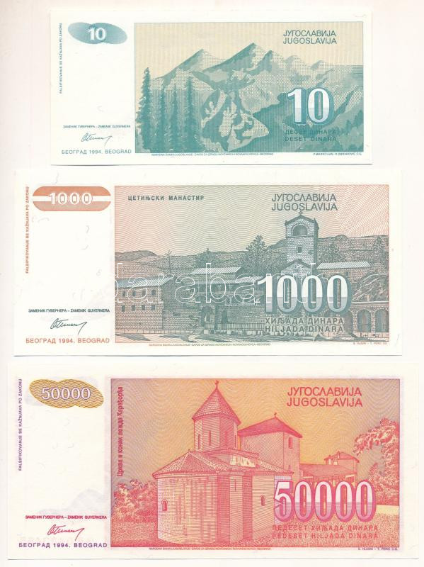 Yugoslavia 1994. 10 Dinara + 1000 Dinara + 50.000 Dinara C:UNC-AU