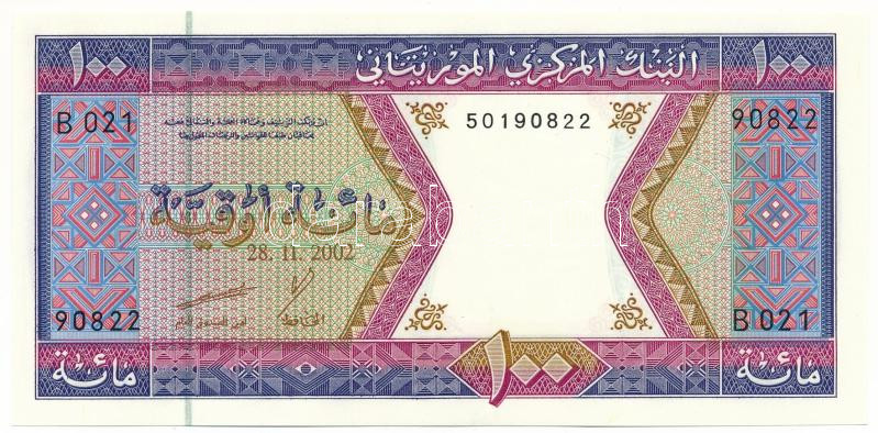 Mauritania 2002. 100 Ouguiya "B 021 50190822" C:UNC, wavy paper
