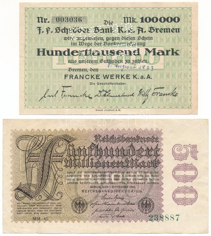 German Empire / Weimar Republic / Berlin, Bremen 1923. 500 Mark + 100.000 Mark with "BEZAHLT 6.8.1923" cancellation C:F