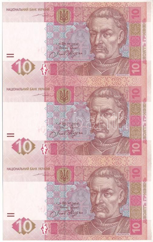 Ukraine 2004. 10 Hryven uncut sheet of 3, with consecutive serials C:AU