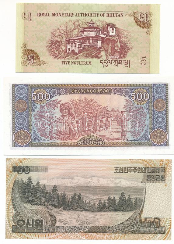 Mixed: North Korea 1992. 50 Won + Lao 1988. 500 Kip + Bhutan 2006. 5 Ngultrum C:UNC,AU
