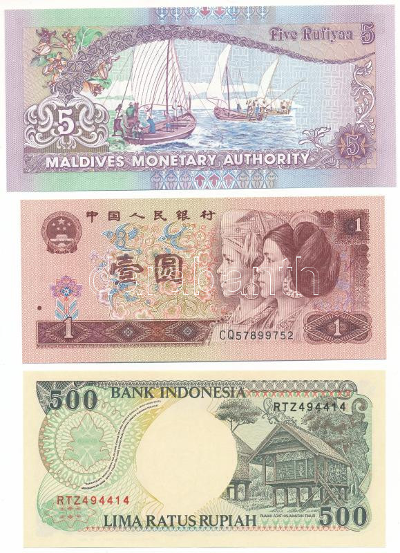 Vegyes: Indonézia 1992. 500R "RTZ494414" + Kína 1996. 1Y "CQ57899752" + Maldív-szigetek 2000. 5R "F0923253" T:UNC,AU