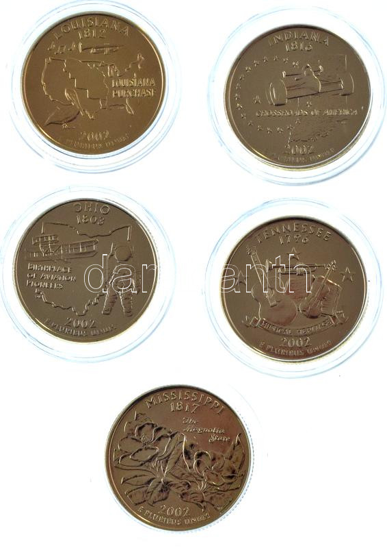 Amerikai Egyesült Államok 2002. 1/4$ "50 állam" sorozat 5xklf darabja (Tennessee, Ohio, Louisiana, Indiana, Mississippi), mind aranyozott és kapszulában T:AU