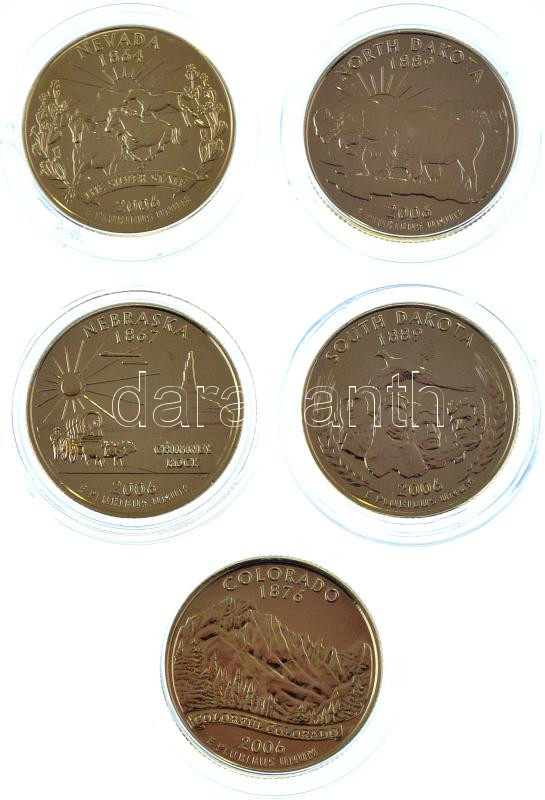 Amerikai Egyesült Államok 2006. 1/4$ "50 állam" sorozat 5xklf darabja (Nevada, Nebraska, Colorado, North Dakota, South Dakota), mind aranyozott és kapszulában T:AU