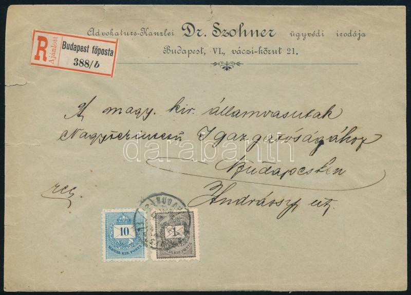 ca. 1891 Budapest helyi ajánlott 2-es súlyfokozatú levél Színesszámú 10kr és Feketeszámú 1kr vegyes bérmentesítéssel, mindkettő 11 1/2 fogazással