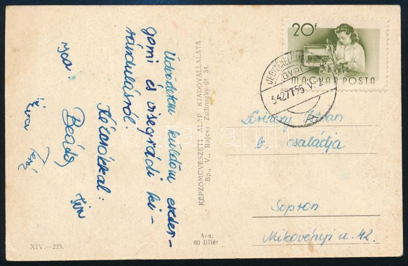 1956 Képeslap (Esztergom) Munka 20f bélyeggel "JEGYZÉKELŐMENET / BVPI / A" rendkívül ritka postai kezelési bélyezéssel
