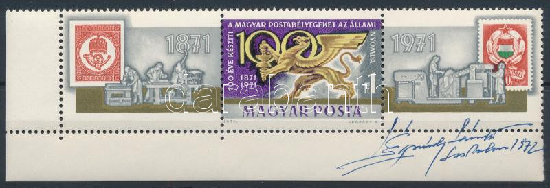 1971 100 éve készít magyar postabélyegeket az Állami Nyomda szelvényes ívsarki bélyeg Légrády Sándor aláírásával