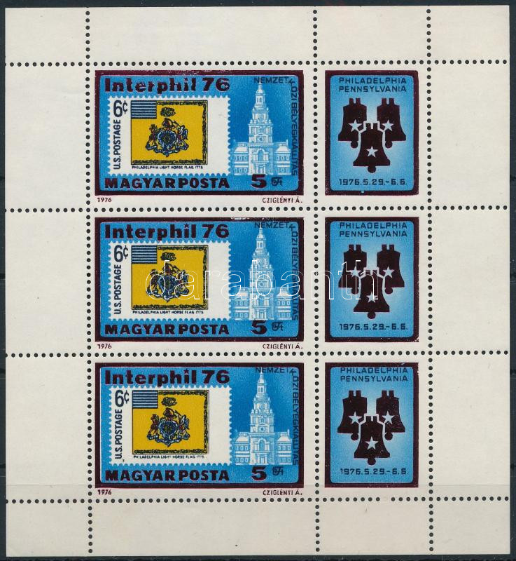 1976 INTERPHIL kisív, hiányos bordó színnyomat, a 3. bélyeg bal szélén eltolódás miatti fehér csík