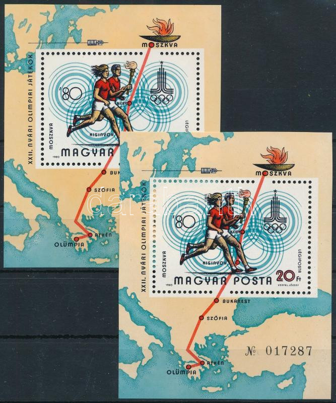 1980 Nyári olimpia blokk, " a fáklya nem vörös csak sárga" lemezhiba + támpéldány