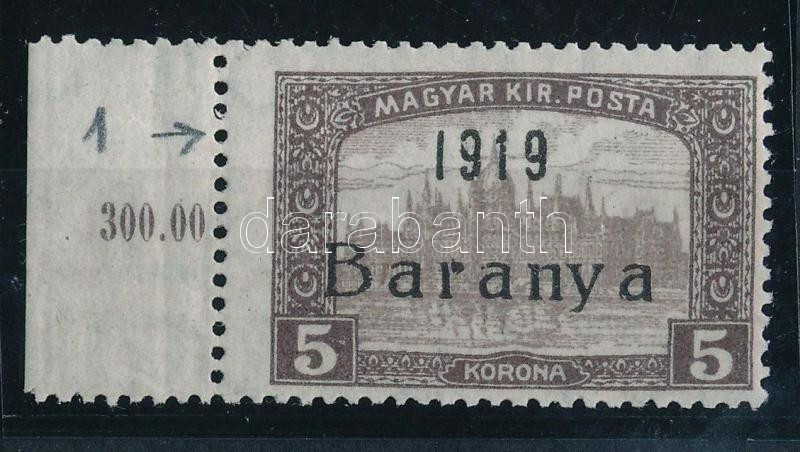 Baranya 1919 Parlament ívszéli 5K zászlós 1-essel, Bodor vizsgálójellel
