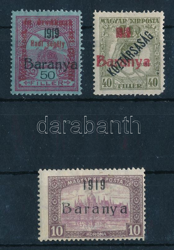 Baranya I. 1919 3 db jobb bélyeg Bodor vizsgálójellel (min 25.500) (40f sarokhiba / missing corner, 10K ráncok / creases)