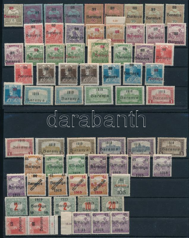 Baranya I. 1919 67 db bélyeg Bodor vizsgálójellel 2 stecklapon, közte lemezhibák, elcsúszott felülnyomások (min 31.150)