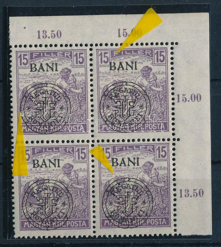Kolozsvár 1919 Arató 15f ívsarki 4-es tömb lemezhibákkal, Bodor vizsgálójellel