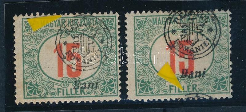 Nagyvárad 1919 Pirosszámú portó 2 db 15f eltolódott felülnyomással, Bodor vizsgálójellel