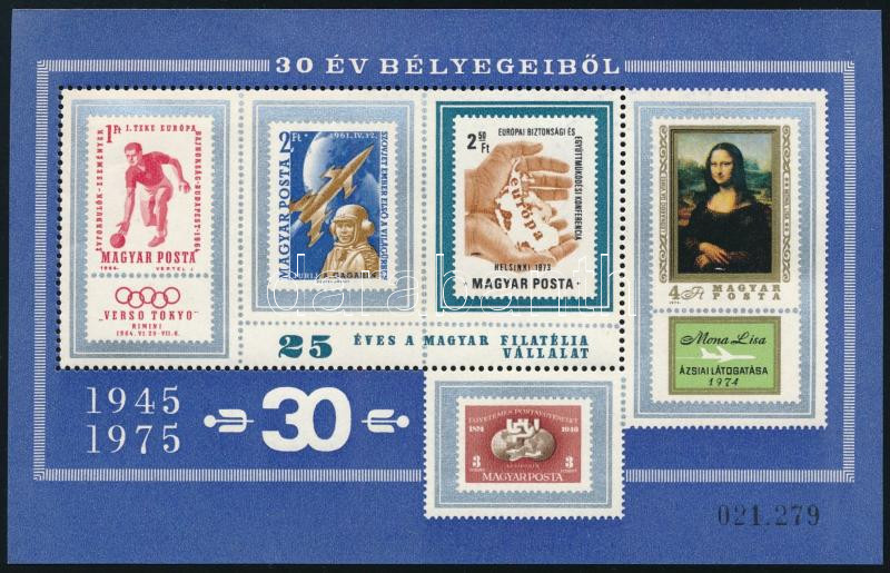 1975 20 db 30 év bélyegeiből fogazott emlékív, 1 kivételével sorszámkövetőek