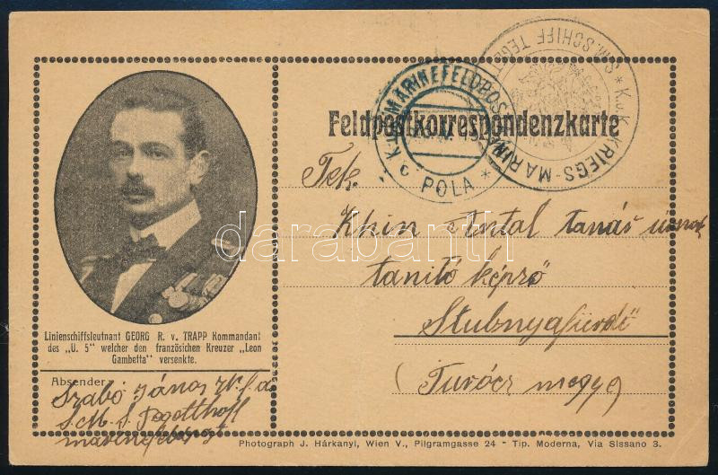 1915 Tábori posta képes levelezőlap "K.u.K MP / POLA" + "K.u.K. KRIEGS-MARINE / SM SCHIFF TEGETTHOFF"