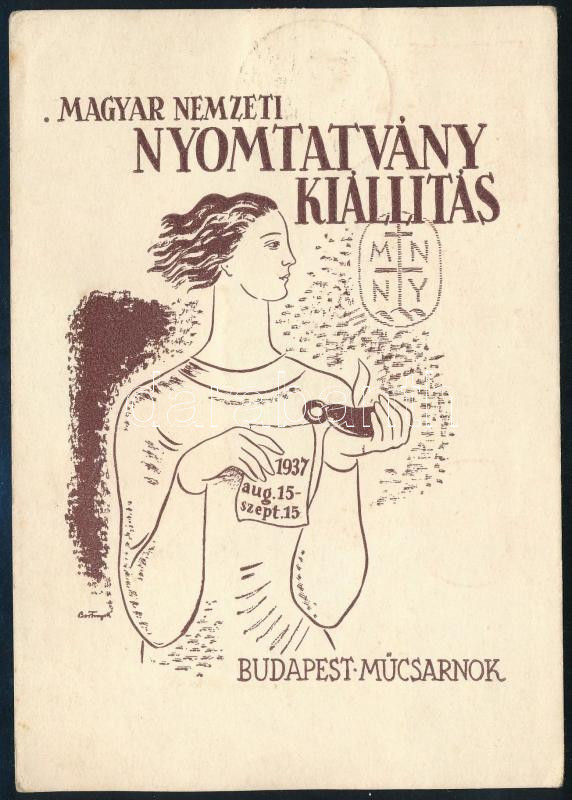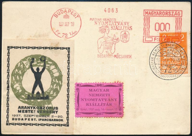 1937 Alkalmi levelezőlap gép bérmentesítéssel és 2 db levélzáróval, "MAGYAR NEMZETI NYOMTATVÁNY KIÁLLÍTÁS" alkalmi bélyegzéssel