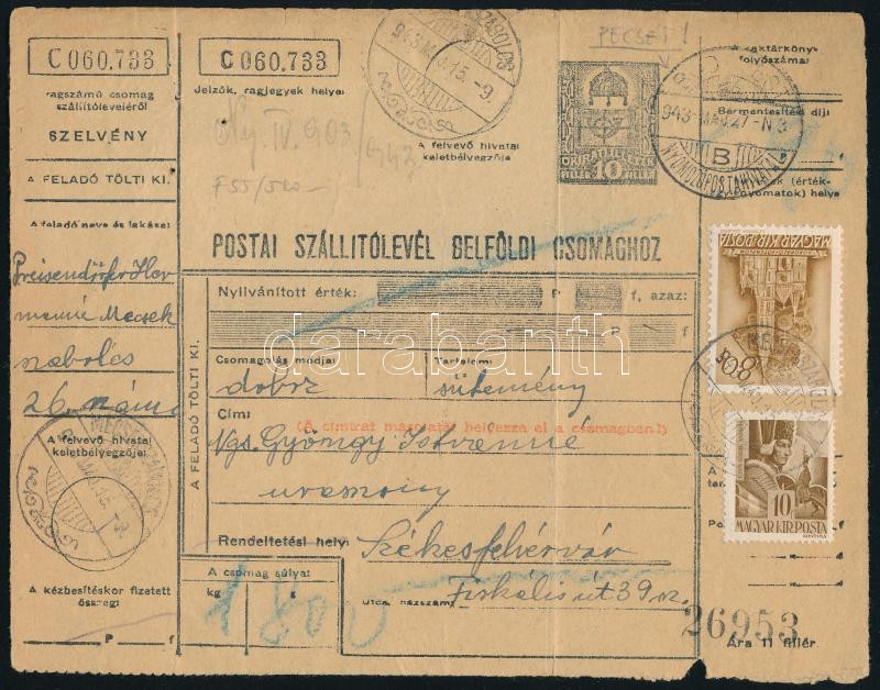 1943 Teljes csomagszállító 2 db bélyeggel, "BUDAPEST / NYOMOZÓPOSTAHIVATAL" bélyegzéssel