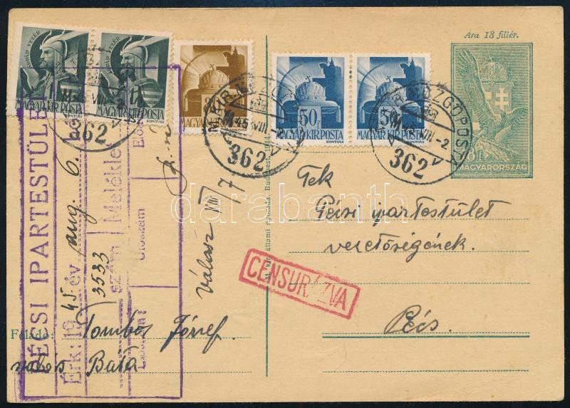 1945 (2. díjszabás) Cenzúrázott levelezőlap 5 db infláció előtti bélyeggel / Censored postcard with 5 stamps