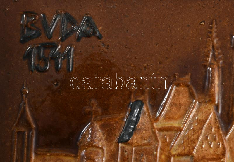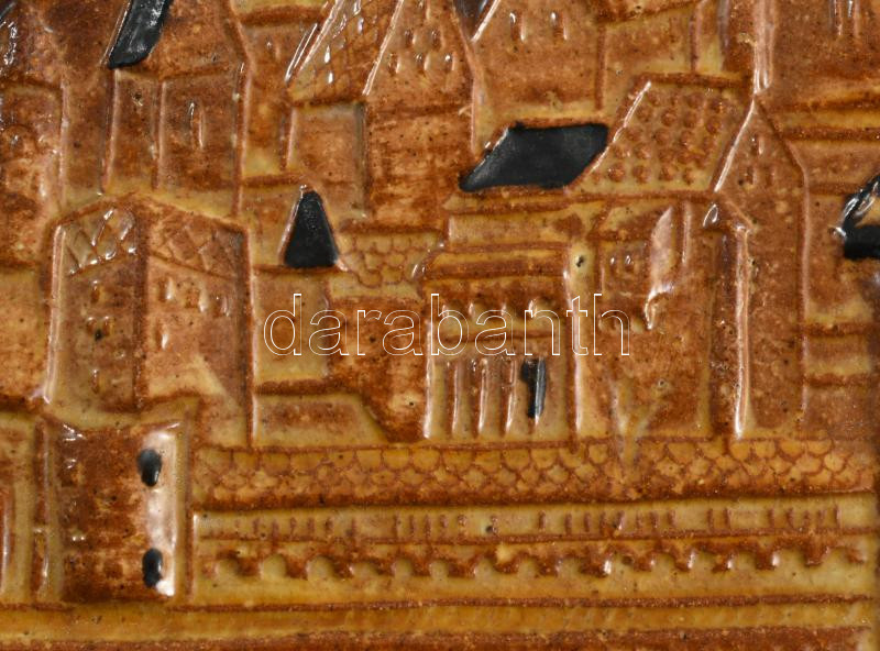 Zákány Eszter: Buda. Mázas samottos kerámia plakett, jelzett, zsűri címkével, 21x13 cm