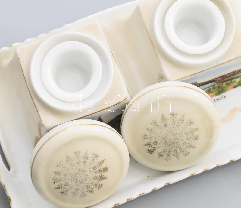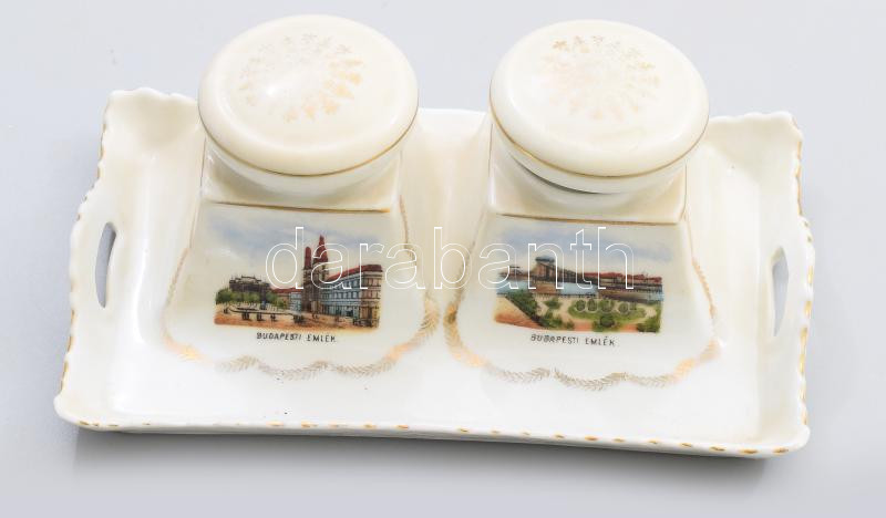 Victoria China Budapesti emlék kalamáris, tégelyekkel, jelzett, 18x11 cm