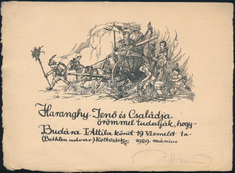 1929 Haranghy Jenő (1894-1951): Haranghy és családja, fametszet, papír, jelzett, 12,5×17 cm